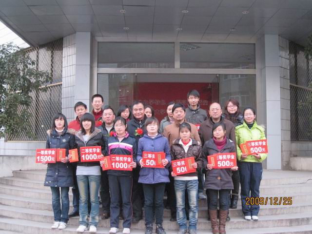 颁奖典礼在热烈的掌声中开始,首先,生化系党总支副书记章兵宣读了2009年获得“弋江酒业奖学金”的学生名单。接着,弋江酒业有限公司总经理陈曾木发表讲话,他向获奖学生表示衷心的祝贺,并鼓励大家继续努力学习。系总支潘世春书记最后作了重要讲话,他代表生化系全体师生首先感谢弋江酒业有限公司在我系设立的奖学金,感谢弋江酒业有限公司对教育的关心与支持,同时他希望获奖同学要珍惜荣誉、勤奋学习,早日成才最终回报社会。获奖学生代表王静同学发言,她说:“感谢弋江酒业带给我的这份荣誉,人生能有几回搏,人生总得搏几回,我仍需努力!”现场同学对她的发言报以热烈掌声。最后,王玉芳等18名获奖同学上台领奖,并于嘉宾、领导合影留念。
