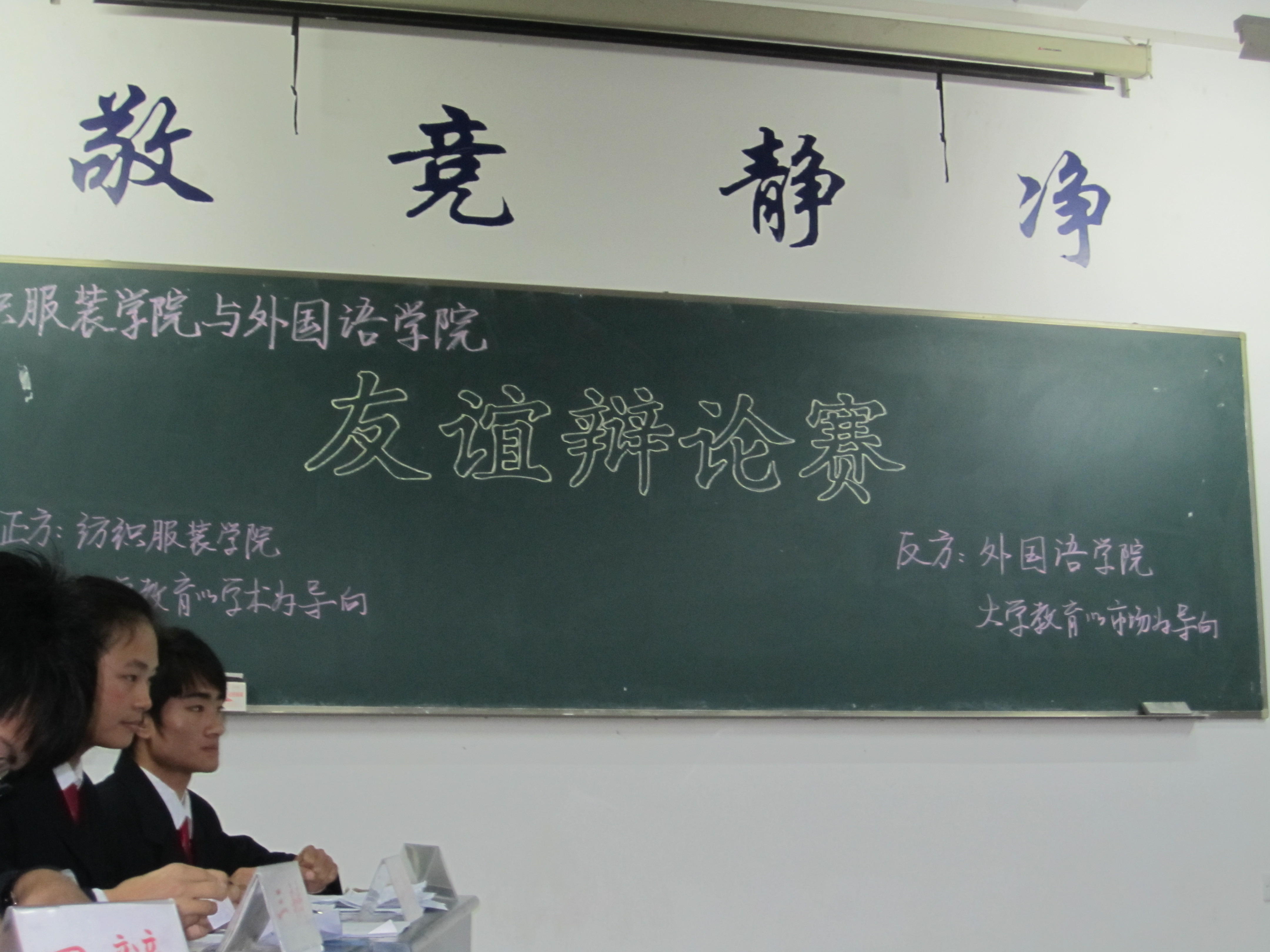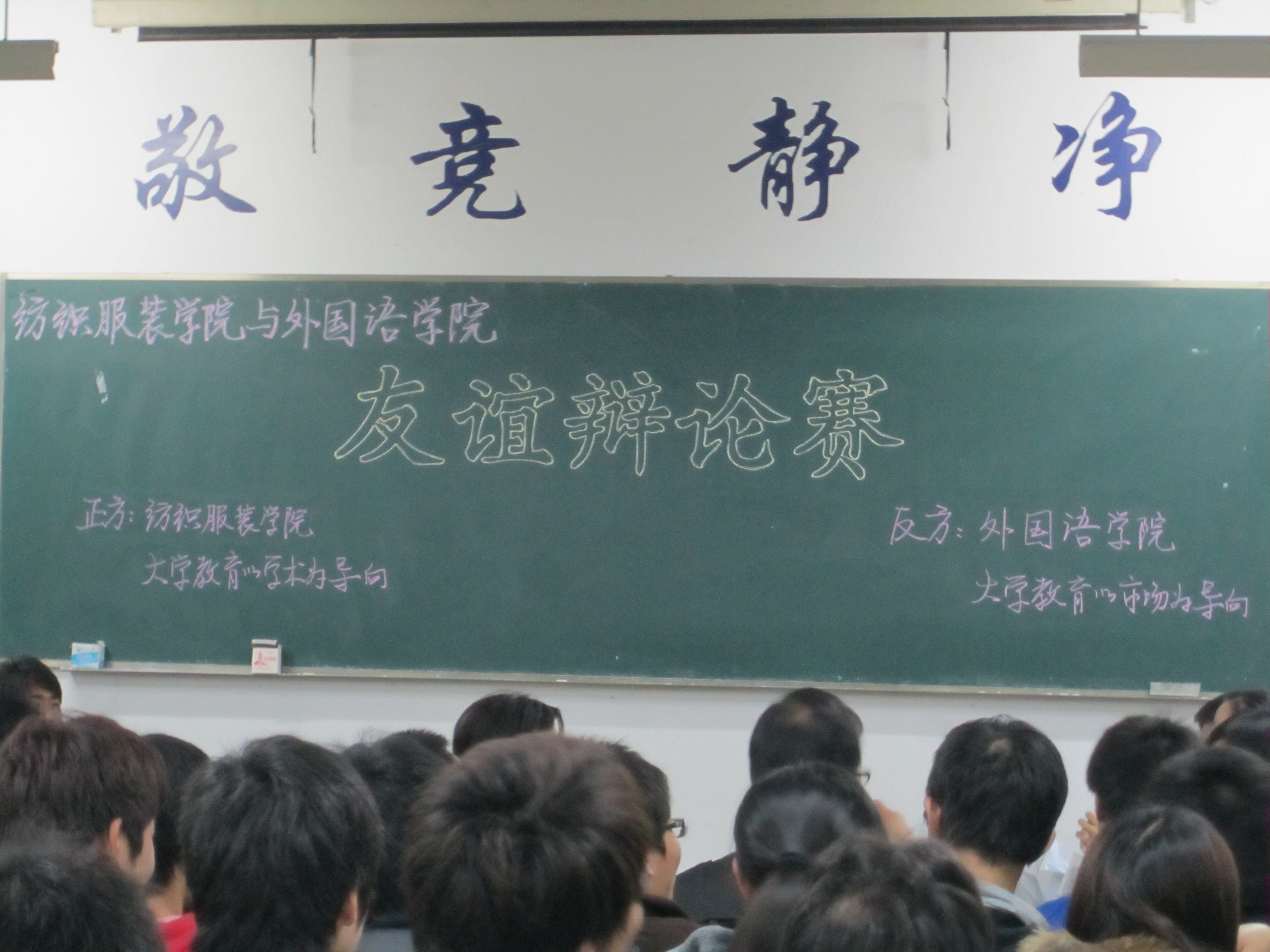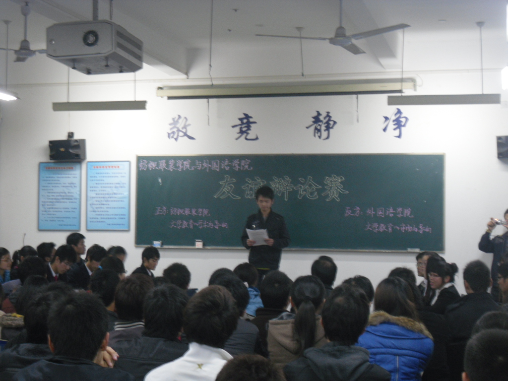 赛前,两学院的六位同学代表朗诵了马克思名篇《青年的选择》。辩论赛过程中,正方是纺织服装学院和反方是外国语学院围绕“大学教育以学术为主,还是以市场为主”这个辩题,展开辩论。双方当仁不让、立论精彩、妙语横生,现场掌声不断。 本次辩论赛本着“友谊第一,比赛第二”的原则,旨在加强两院之间的合作与沟通,增进友谊,为两院党校培训班更好的交流与学习进行了有益的尝试。