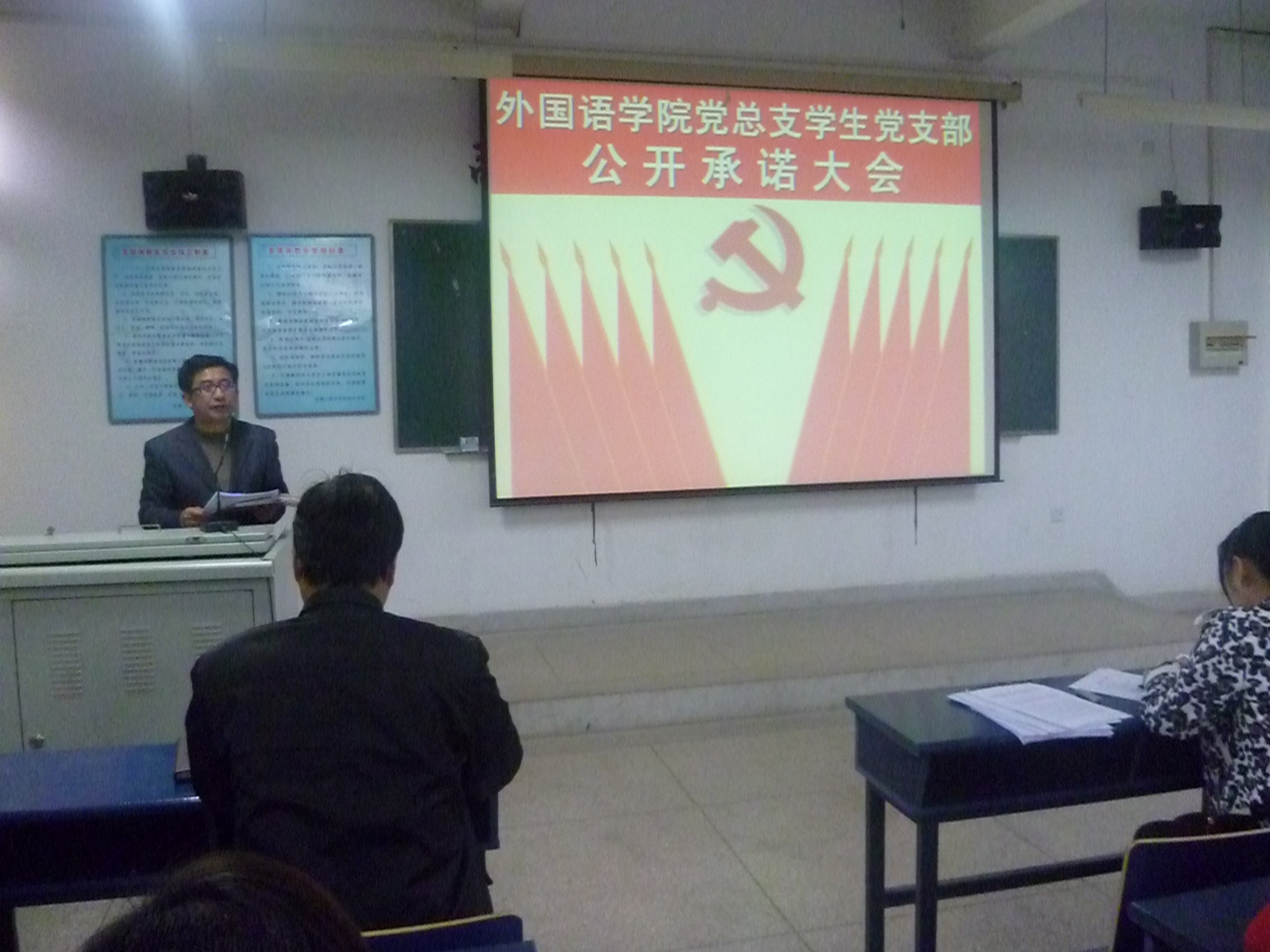 在全党上下开展“创先争优”活动之际,在建党90周年即将到来之时,4月30日下午,外国语学院学生党支部在9教101教室举行了学生党员“创先争优在行动”主题演讲比赛暨“创先争优”党员公开承诺大会活动。院党总支副书记谈丽华,学生党支部书记、团总支书记李烨及全体辅导员出席了此次活动。活动由