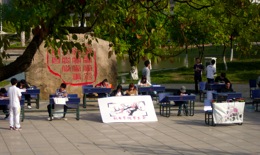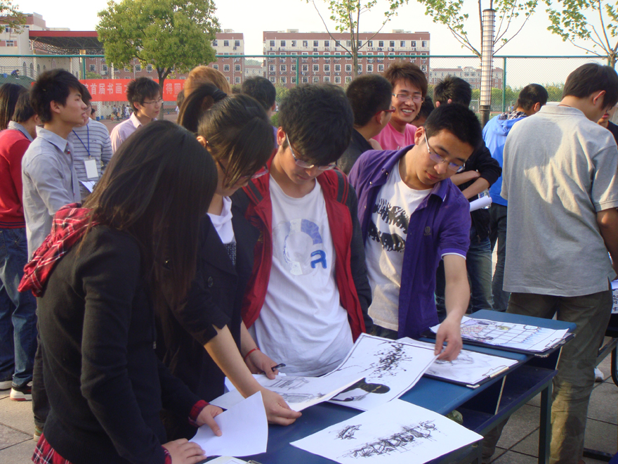 420下午,经过几轮的初赛选拔并脱颖而出的14名选手进入决赛。决赛现场,悠扬的古筝曲环绕着我校的“三做”石,为参赛选手营造出了良好的创作氛围。选手们专心致志,每一次的出笔、涂描都力显完美;作品中刚劲有力的正楷,意味深远的国画时时可见,同时也不乏趣味横生的漫画。在选手一个小时的精心创作后,评审团认真评选,最终,来自纺织2102朱亚光和艺设2101胡家骐两位同学分别获得书法与绘画组一等奖。