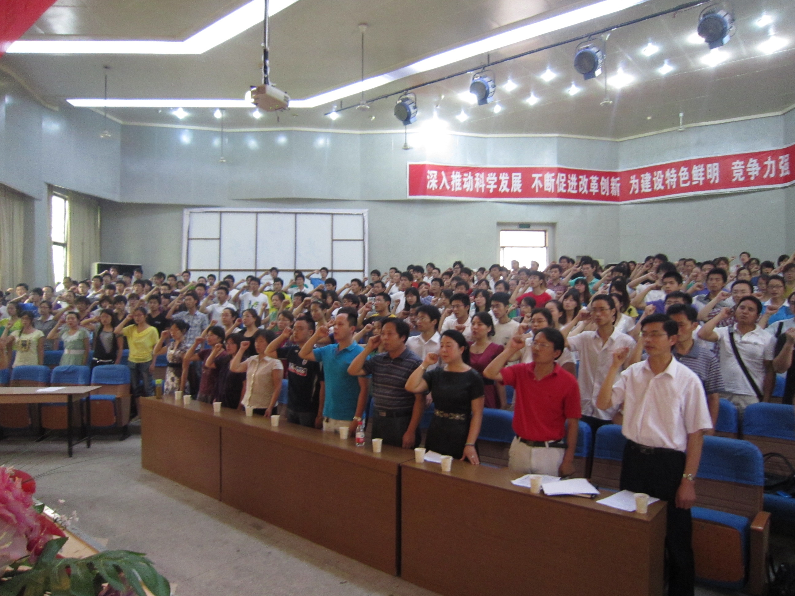 宣誓完毕后余新霞作了热情洋溢的讲话。她首先代表院党委向新加入中国共产党组织的党员同志们表示衷心的祝贺。指出,新党员面向党旗进行入党宣誓,既是发展党员工作必经程序,又是对党员进行生动的党的观念教育和自我教育的一种形式;老党员重温入党誓词,可以使自己时刻用誓言来激励自己,牢记自己的承诺,永葆坚定的党性。余书记充分肯定了我院教工党员、学生党员在自己的工作、学习岗位上默默无闻地践行着一个普通共产党员的誓言,发挥着共产党员的先锋模范作用,为校院的建设与发展作出了巨大贡献。最后,她代表学院党委号召全体党员同志,在毕业生离校和期末工作中,主动到学生中去,加强沟通,帮助他们解决问题和困难,学生党员务必做到诚信考试,杜绝考试舞弊、违纪的事态发生。