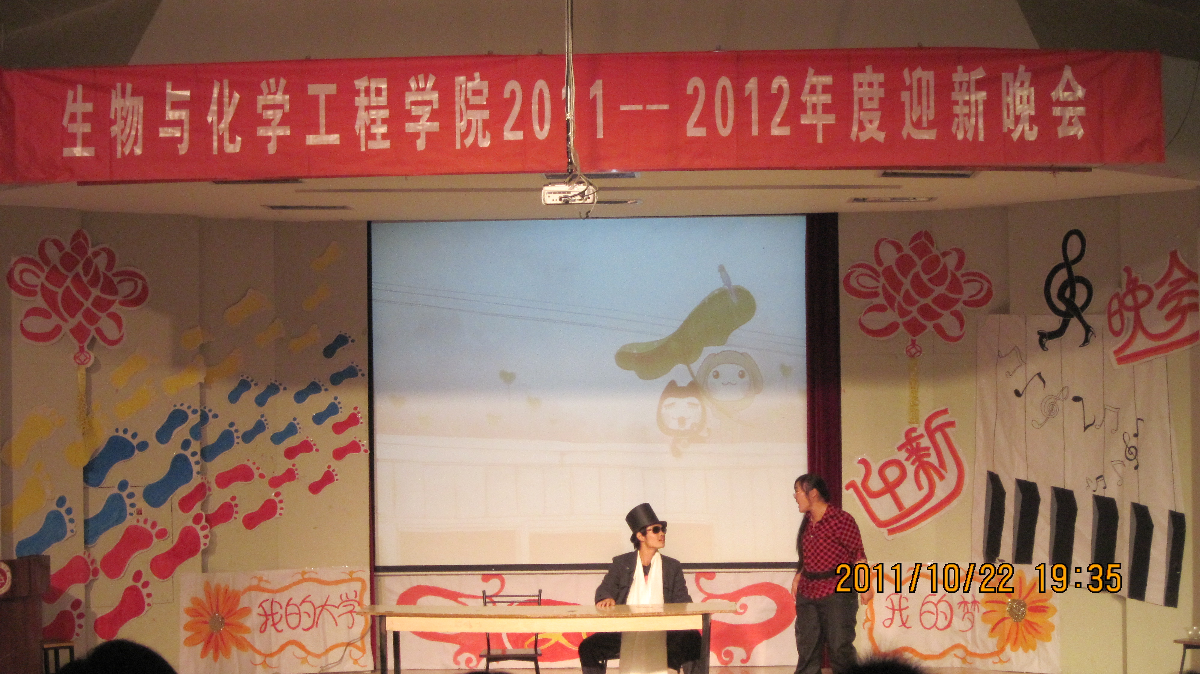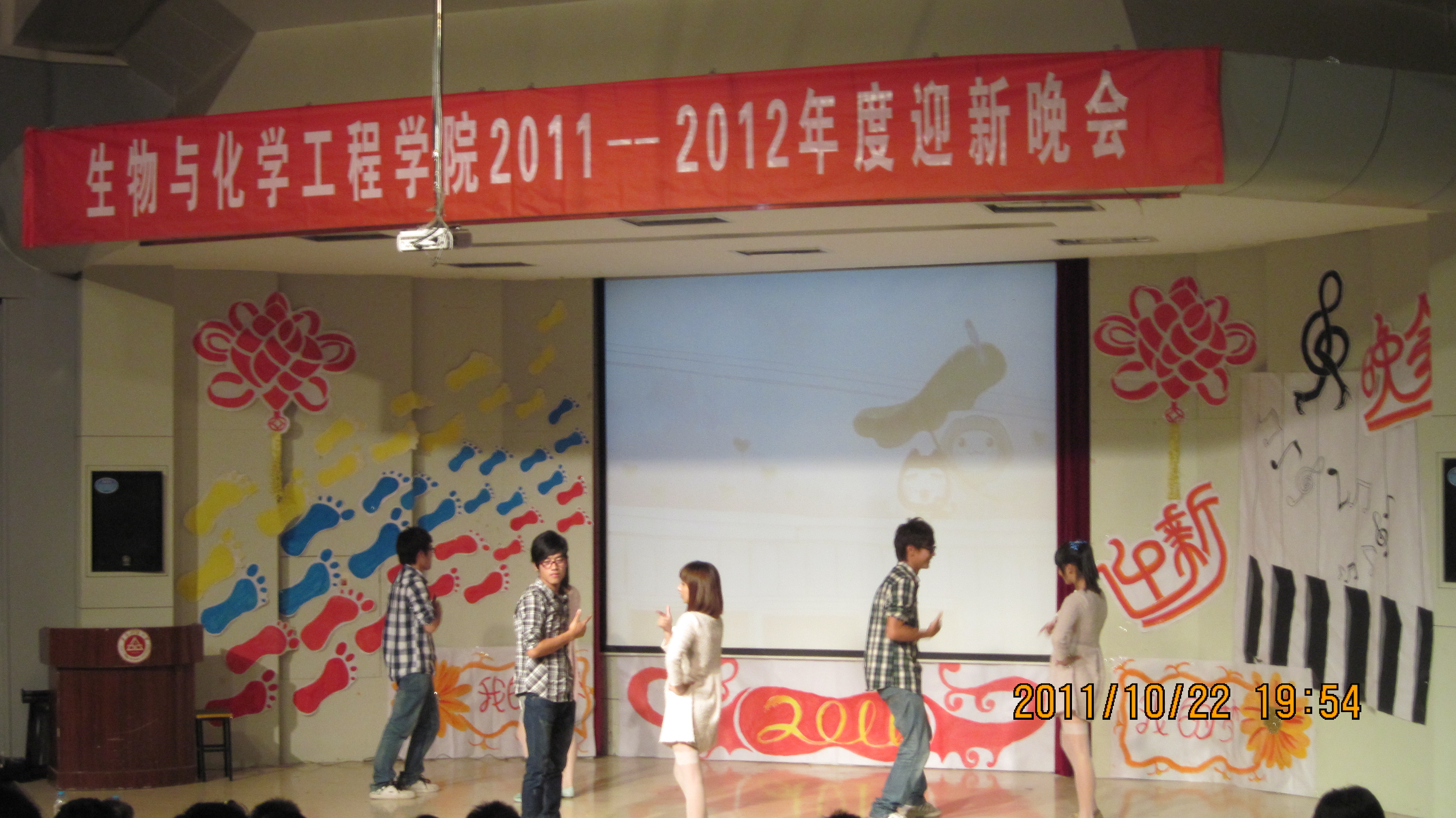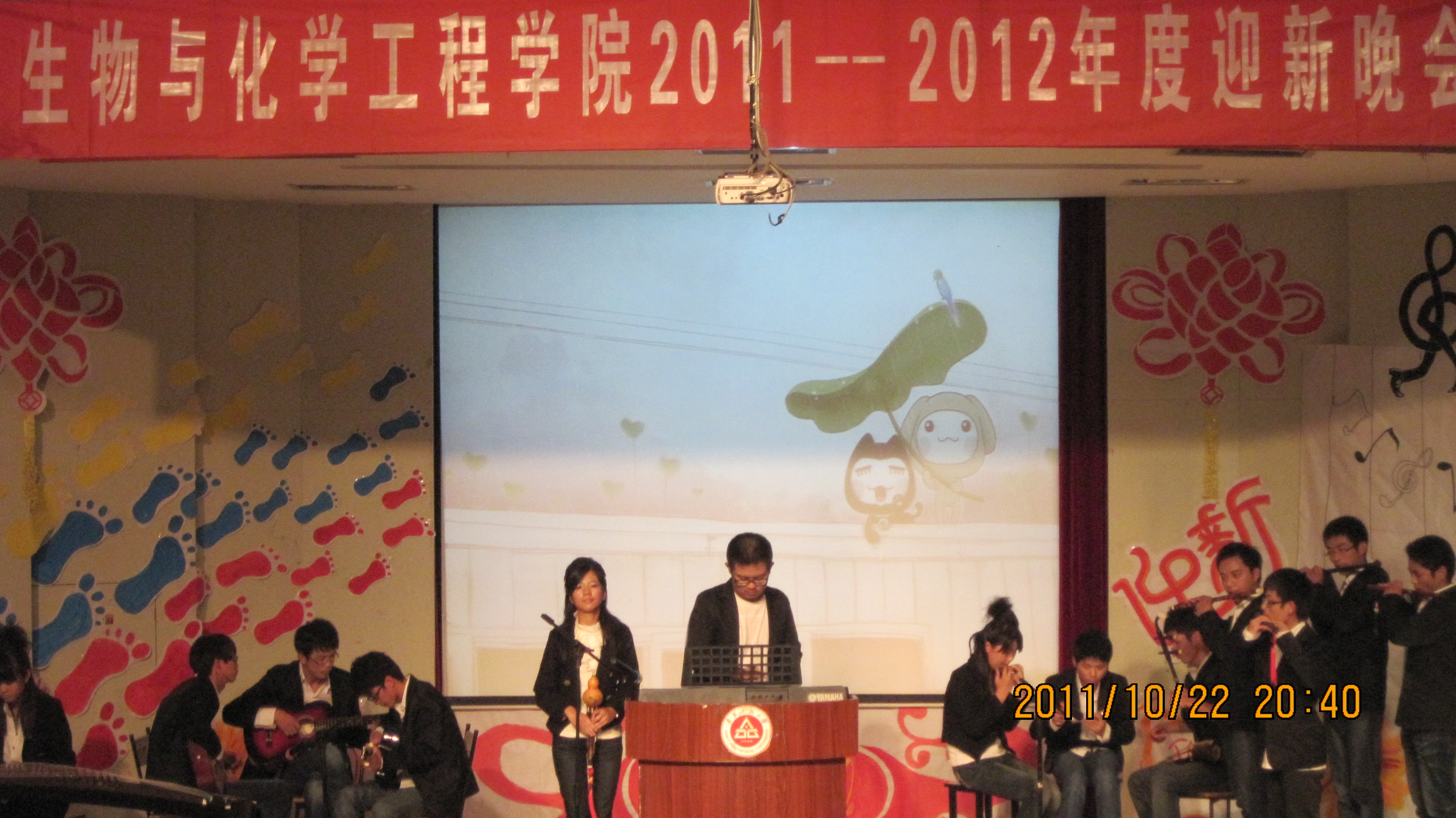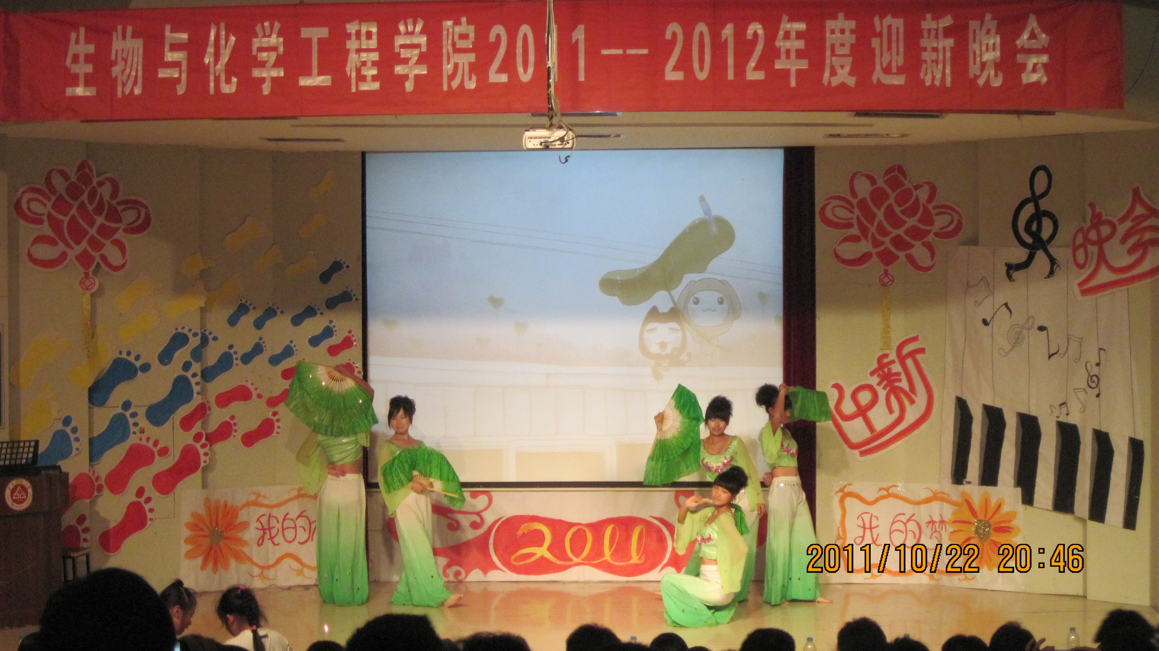 为丰富校园文化生活,给新同学们一个真正展示自我风采和勇气的舞台。2011年10月21日晚,生物与化学工程学院2011迎新晚会——“我的大学,我的梦”在学术报告厅揭开了它神秘的面纱。在生化学院工作人员将近2小时的精心布置下,晚会现场到处都弥漫着欢乐的氛围。生化学院副院长 晚7:00整,晚会在一段精彩绝伦的武术表演中拉开了序幕。随后演绎《快乐崇拜》的小伙子们用火辣动感的舞姿把在场观众的热情瞬间点燃了。相声《豪爽的爸爸》讲述了开学初一位新生的爸爸在学校发生的趣事,让观众们乐开了怀。歌伴舞《天使的翅膀》用口琴演绎动人旋律,伴着优美的舞姿,把现场观众带到一个如痴如醉的氛围中。情歌对唱《不得不爱》深情无限,感人至深,把发生在校园的唯美爱情演绎的纯真浪漫。原创小品《一见如故》和《考试风云》紧密联系校园生活,台词幽默诙谐,表演生动传神,引起场下观众的共鸣,赢得老师与同学们的热烈掌声与阵阵喝彩,将现场气氛推向高潮。舞蹈《菏塘月色》和《达浪舞》舞出花样年华,乐器合奏《天空之城》演绎天籁之音,歌曲串烧唱响青春誓言。这些风采各异的节目,为晚会增色不少。而此次晚会的互动环节——《家长留言》,也是本次晚会的亮点动情之处。早在新生开学报道伊始,就为这次晚会的互动环节做了充分准备,召开新生家长会时,让家长们写下了对孩子的寄语。一条条鼓励的寄语,一份份无限的希望;一条条温暖的寄语,一份份不舍的牵挂……现场观众心中顿生感动无限,新生们视频的家长勉励话语后,立志一定努力学习、完善自我,不辜负父母的期望。最后,晚会在电光火石的双节棍精彩表演中落下了帷幕。