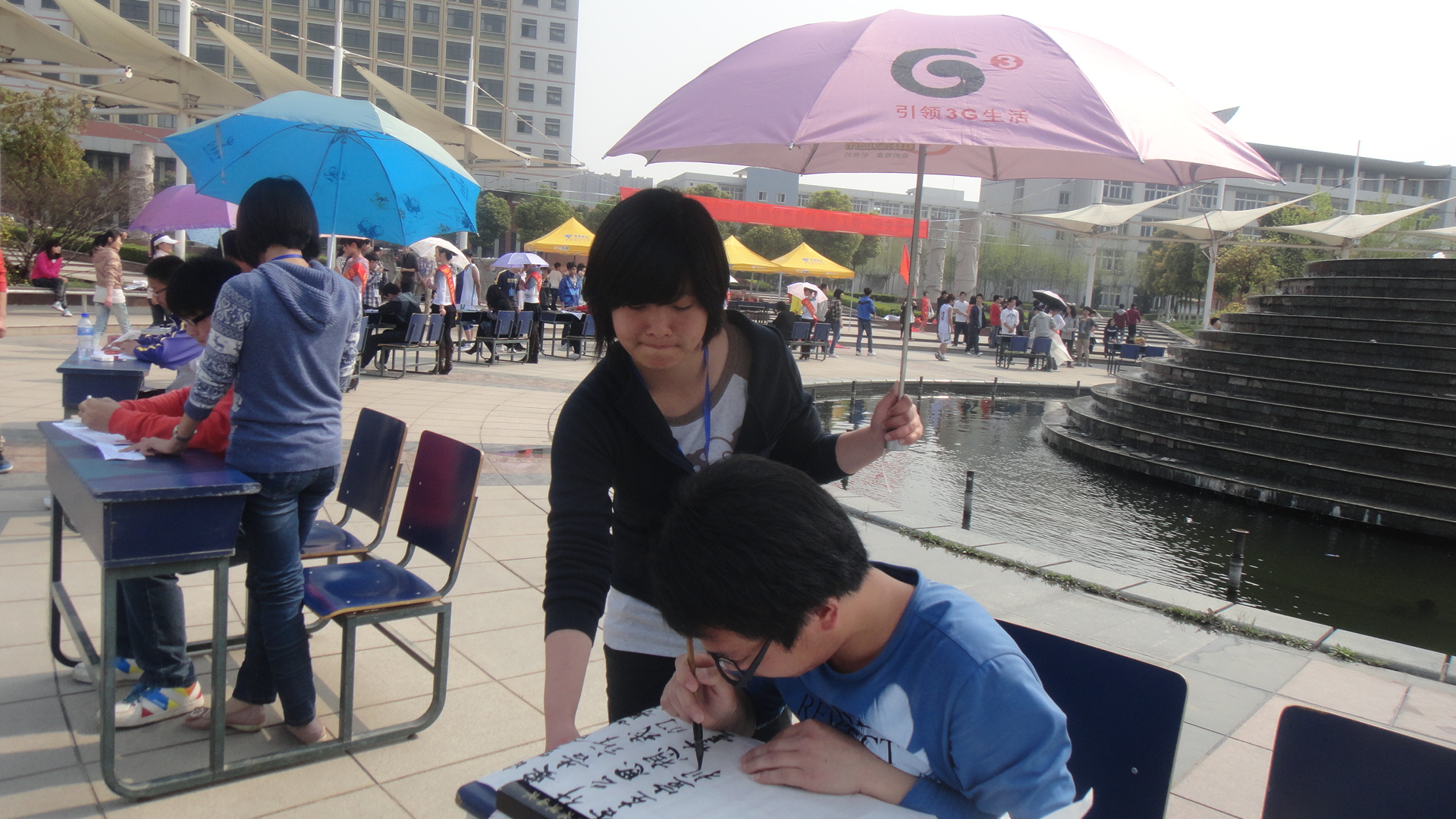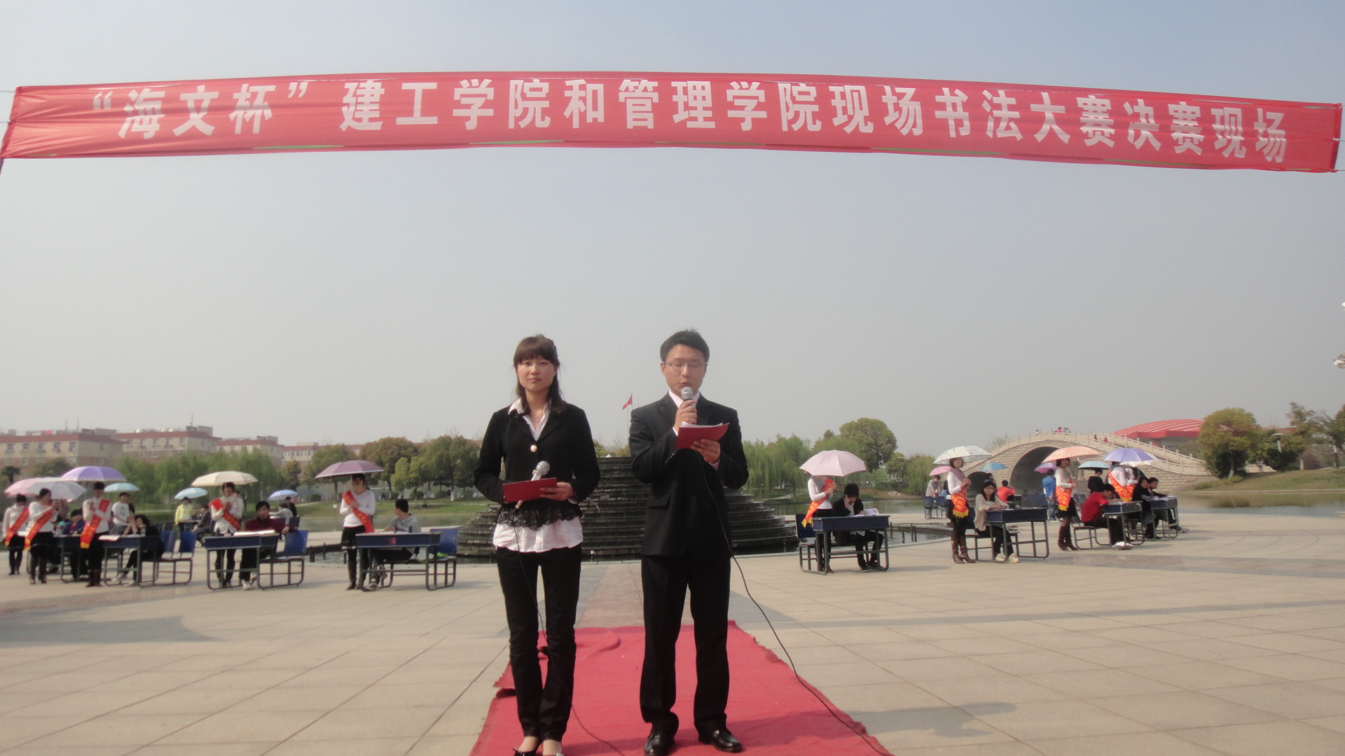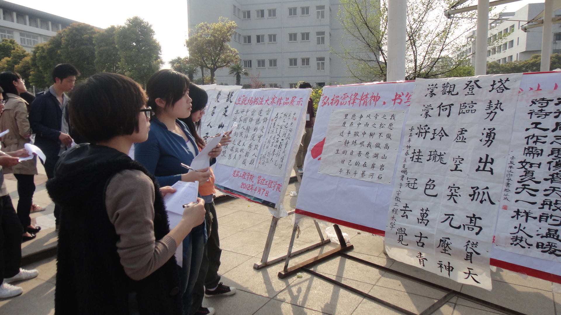 莺莺春日,校园湖畔。建筑工程学院与管理工程学院联合举办的现场书法大赛决赛于4月7下午2:30,在校喷泉广场隆重举行。本次比赛旨在“弘扬雷锋精神,继承传统文化”。参加此次比赛的评委有校学生会及各学院的学生会宣传部长,我院刘海涛老师也莅临决赛现场进行指导,并向有关负责同学询问比赛的组织情况。