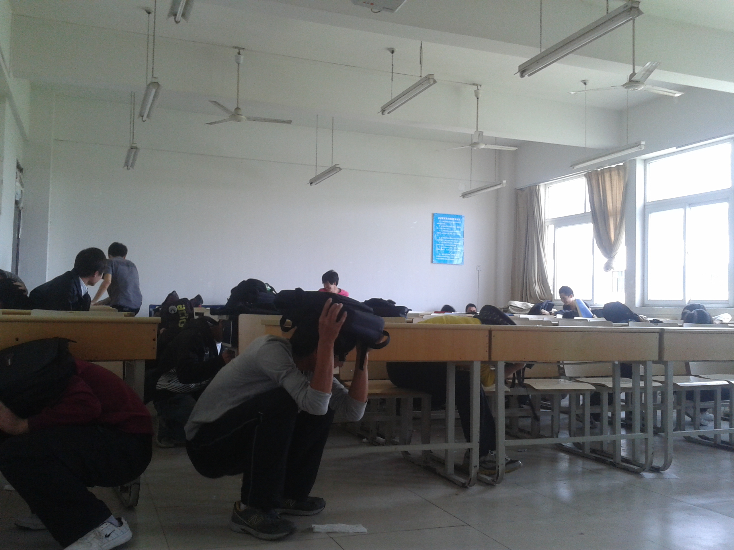 活动开始前,梁雪松老师向参与本次活动的同学们介绍了如何应对地震灾害来临的方法以及地震中如何及时的应急疏散等措施。随后,同学们在活动现场模拟了地震发生后紧急避险,地震停止后紧急疏散。在有效的逃生时间中,同学们能按照规定动作,指定路线,迅速逃生,防震应急疏散取得了圆满成功。