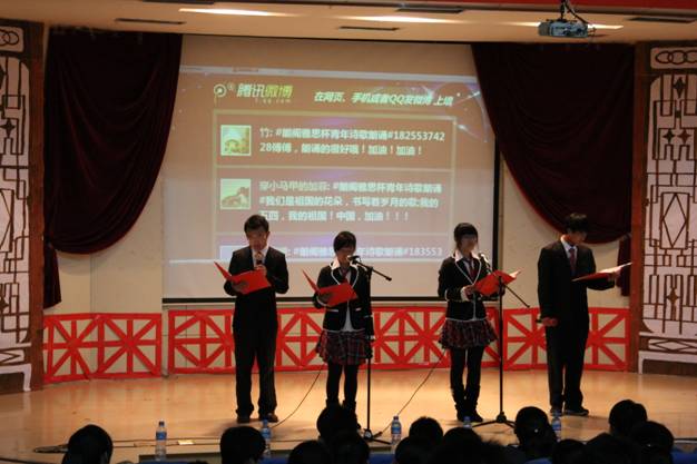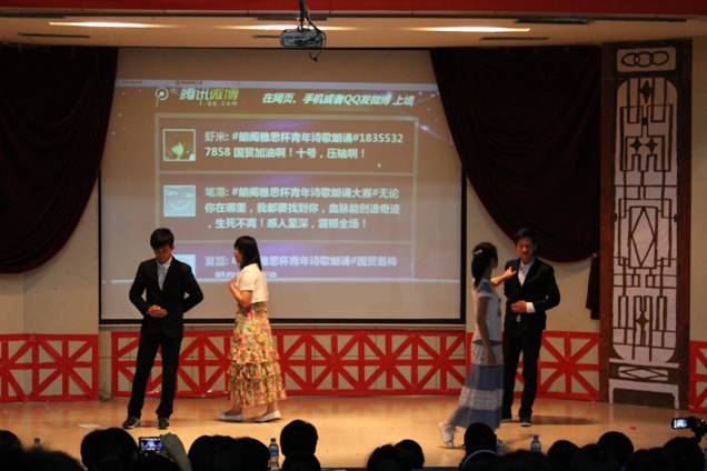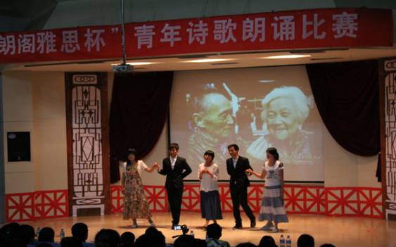 经过初赛的选拔,来自我院各专业的十组选手齐聚一堂,进行最后的角逐。本次比赛分为自选诗歌朗诵和随机应变两个环节,在激情澎湃的集体朗诵《五四,永不息》后,比赛正式拉开帷幕。来自我院国贸111班齐燕、陈冬霞等同学朗诵的原创诗歌《园丁颂》声情并茂、绘声绘色的歌颂了广大辛勤教书育人的老师们,浓郁的青春气息以及搭配的情景剧表演形式给现场观众留下了深刻的印象。工商111班周玲玲、李祥等同学朗诵的《我的祖国》以慷慨激昂的情调表达了对祖国的无限热爱和对中华民族不屈不挠精神的深深叹服。一篇《生死不离》在物工112班高留艳同学的动情演绎中表达了对灾区人民的关爱之情,同时赞颂了5·12地震中涌现的一批英雄人物。最后,由国贸112班王飞、张霄、黄家琪、吴兰兰等同学朗诵的舒婷经典著作《致橡树》将歌曲、舞蹈等艺术表现形式与朗诵完美结合,他们以饱满的热情、轻盈的舞蹈展现了文革结束后年轻人对爱情的勇敢追逐,也表现了现代大学生对高尚爱情的向往之情。在随后进行的随机应变环节,各位选手通过对经典影视剧配音、声泪俱下读菜谱等颠覆正常情感的段子将现场气氛带到另一个高潮。比赛过程中场下观众通过“微博上墙”平台发送微博表达自己对五四精神的理解以及对场上选手的支持,整个朗诵比赛精彩纷呈、掌声如潮。赛后,来自营销101班的袁伟同学为大家深情演唱了《暗香》。