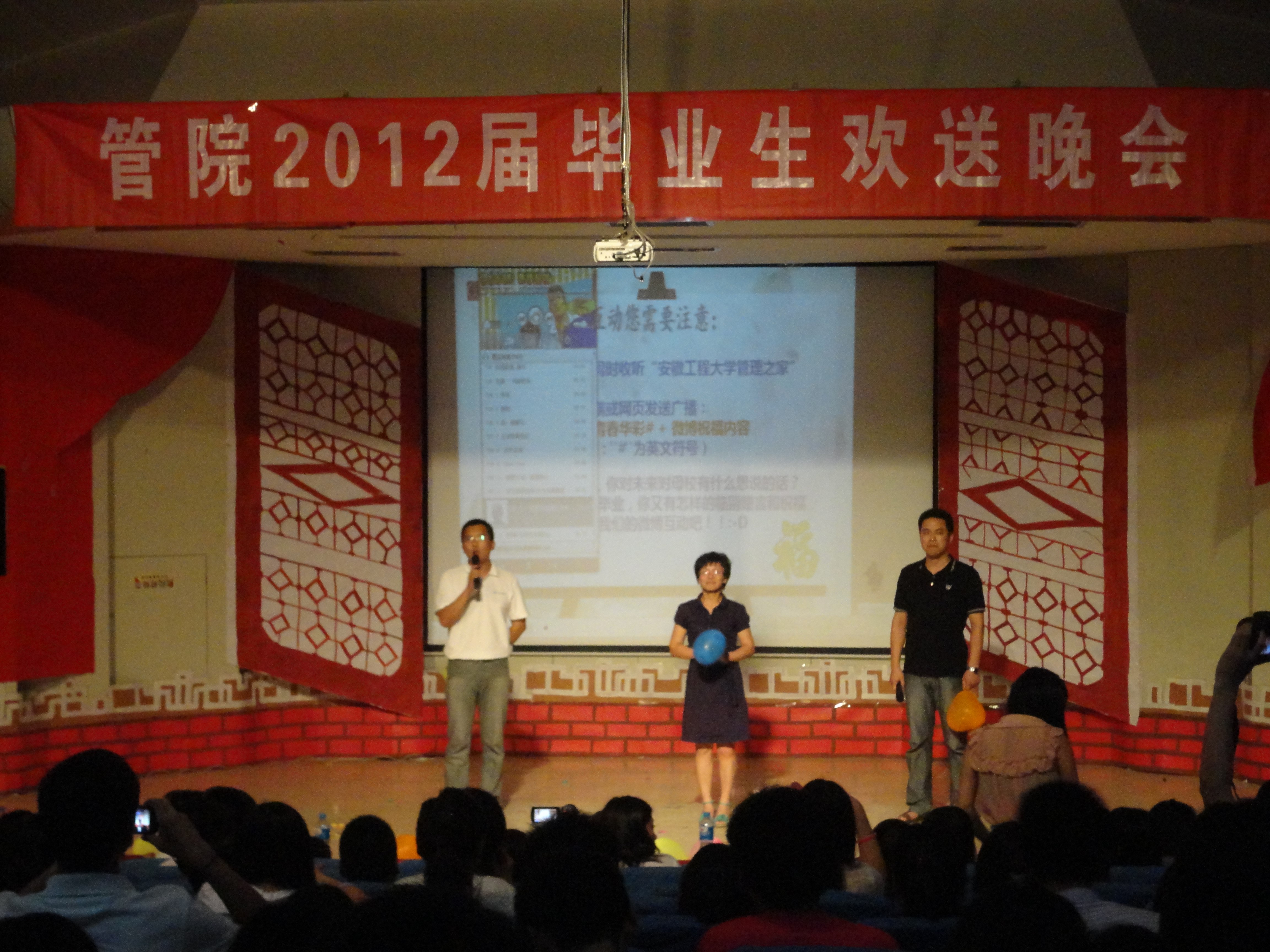 晚会伊始,管理工程学院院长王忠群老师上台发表了热情洋溢的毕业致辞,他首先向2012届毕业生表达真挚的祝贺。王院长说,不管以后的道路是充满荆棘还是宽阔坦荡,你们都要铭记自己的梦想,坚定自己的信念,不管以后遇到什么困难,管理工程学院的所有老师永远是你们坚强的后盾,管理工程学院永远是你们的家。王忠群院长激情的演讲赢得全场老师同学们的热烈的掌声。在开场舞《秀色》中晚会正式拉开序幕。毕业生们带来的歌曲、武术表演、街舞等精彩节目将晚会气氛一次次推向高潮。管理工程学院孙颖老师倾情弹奏了一曲《梅花三弄》,悠扬的旋律蕴藏着学院老师对同学们真挚的祝愿,毕业班辅导员徐晓平、沈明领和黄桂琴同时登台的合唱更是赢得全场热烈的欢呼声。互动环节爱要大声说出来中,众多毕业班同学们勇敢的走上舞台向大家表达了自己离别的不舍,讲述了自己大学四年的感受,对老师同学的感谢以及对管理工程学院这个大家庭的不舍情感。整场晚会过程中,现场观众纷纷通过微博上墙互动平台发送了感言、祝福、毕业感想等,晚会最后在学生会成员带来的歌曲合唱《这里没有陌生人》中圆满结束。
