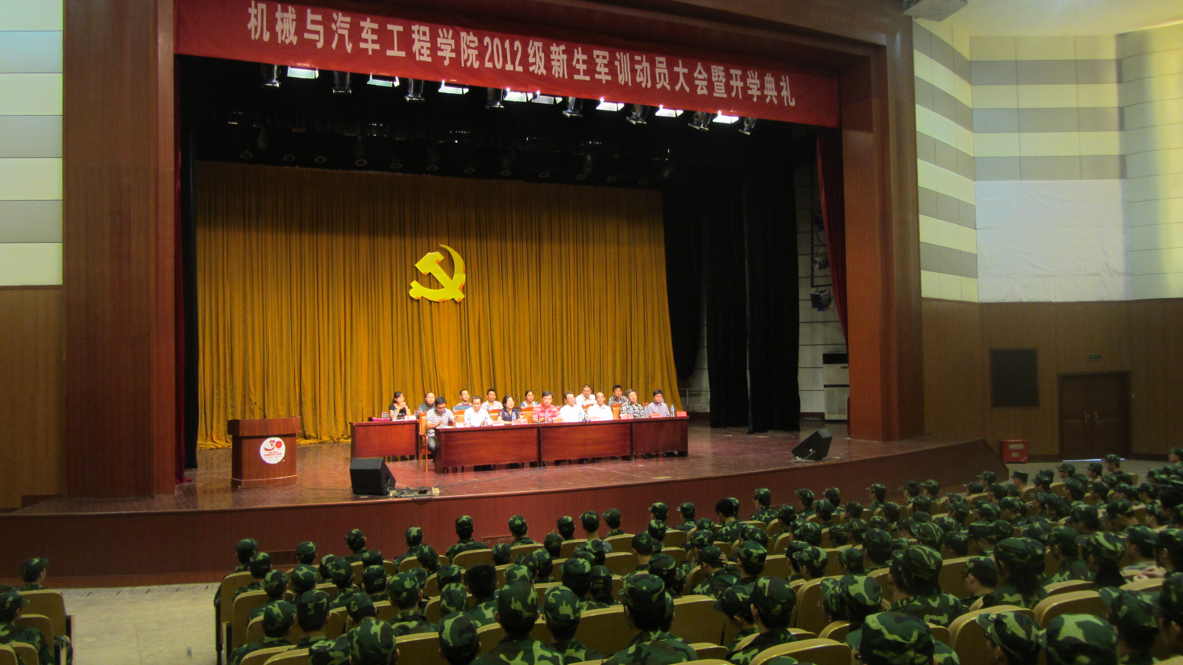 9月10日下午4:30,机械与汽车工程学院2012级新生开学典礼暨军训动员大会在师生活动中心隆重举行,院党委书记邓英扣,院长许德章,院党委副书记周怡,副院长高洪、副院长朱协彬,材料工程系主任张海涛,院团委书记黄炜、教学秘书邢昌、机制教研室主任王雷、材料教研室主任陶锋、测控教研室主任裴九芳、装备教研室主任徐振法,新生辅导员张礼波、孙霞、陈刚出席了大会。