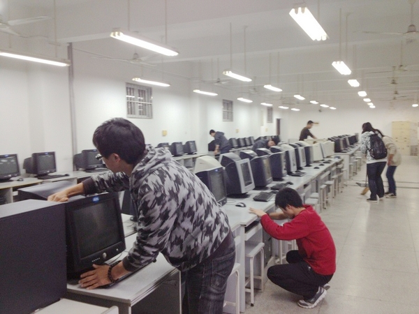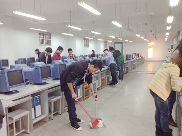 1031下午,计算机与信息学院分党校第二期学生党员培训班组织学员开展了“喜迎十八大召开”主题实践活动,分党校第二期学生党员培训班班主任皇苏斌老师、全体47名学生党员在学院实验中心参加打扫整理实验室的义务劳动。