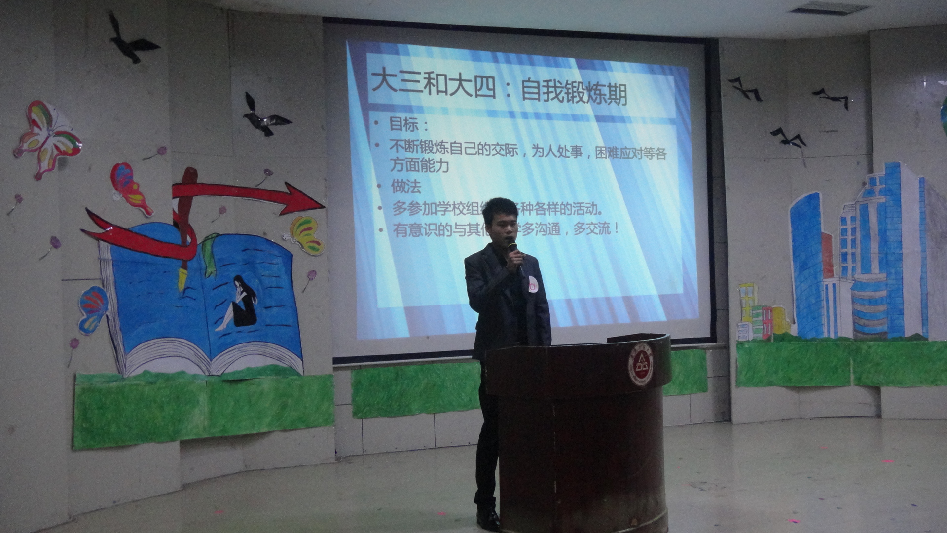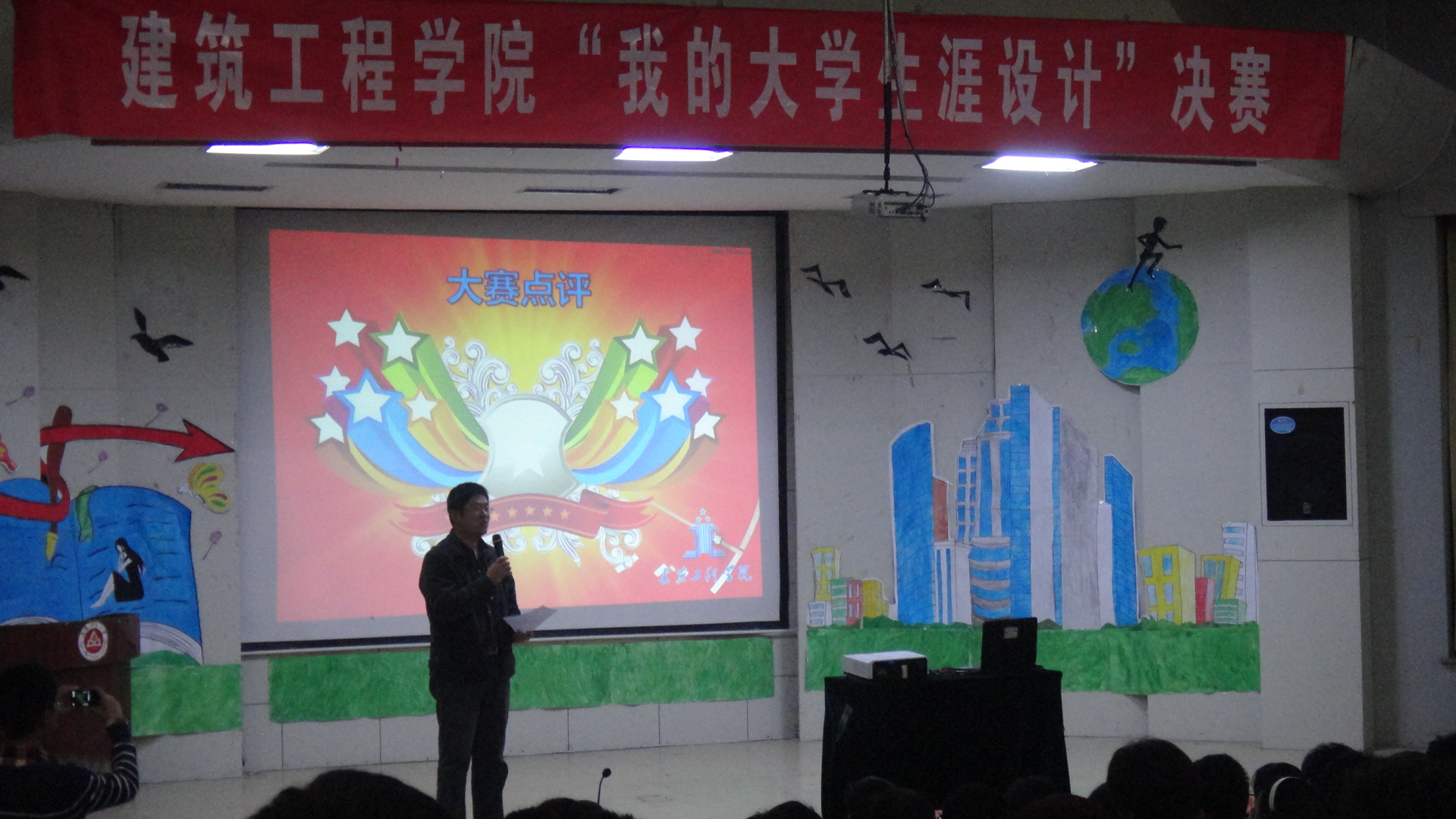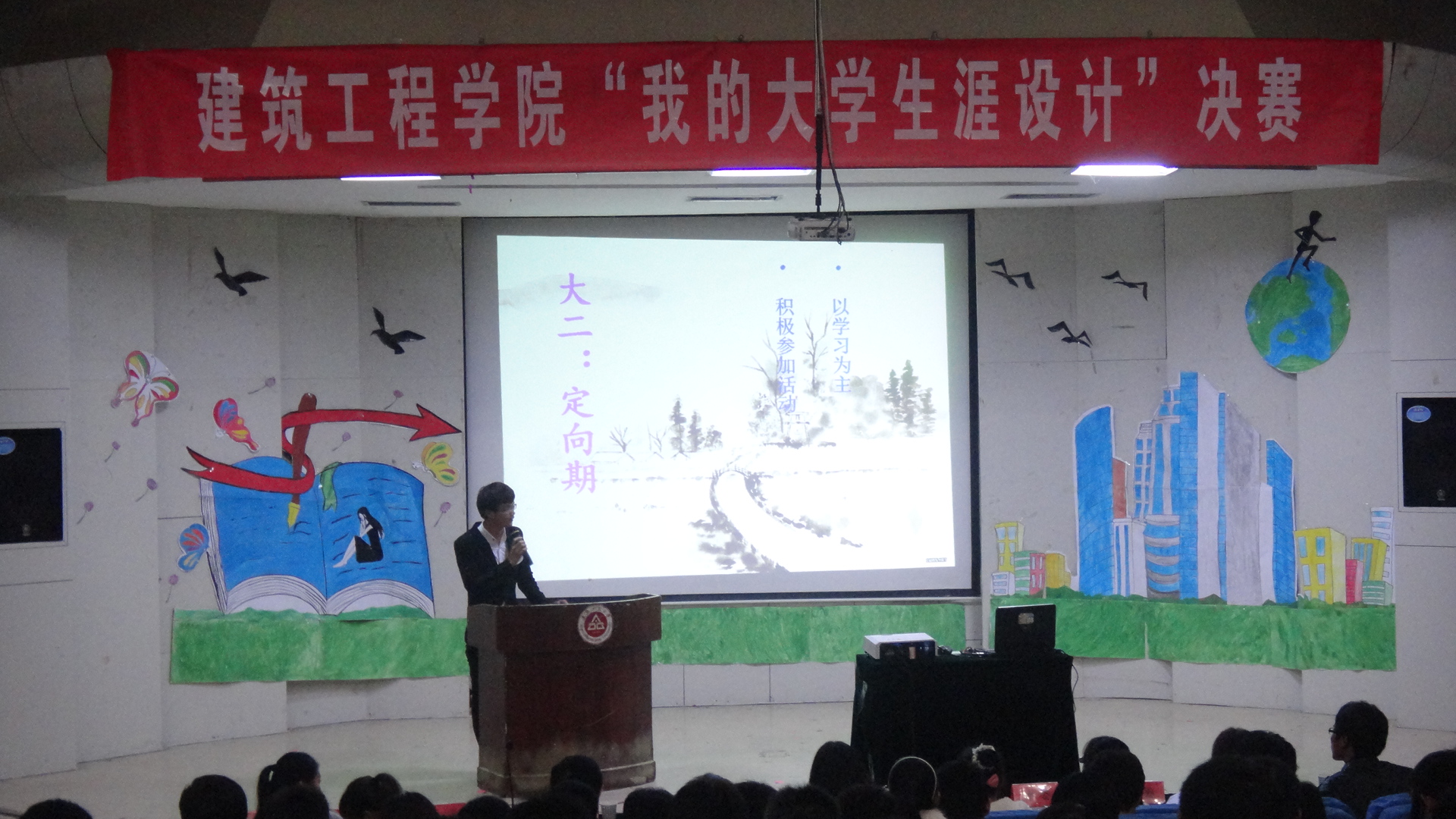 10月24日晚7:00,建筑工程学院第二届“我的大学生涯设计”决赛在学术报告厅如期举行。莅临现场的老师有辅导员刘海涛、李茜和付晓惠老师。上届校“我的大学生涯设计”级获奖者担任此次比赛的评委。