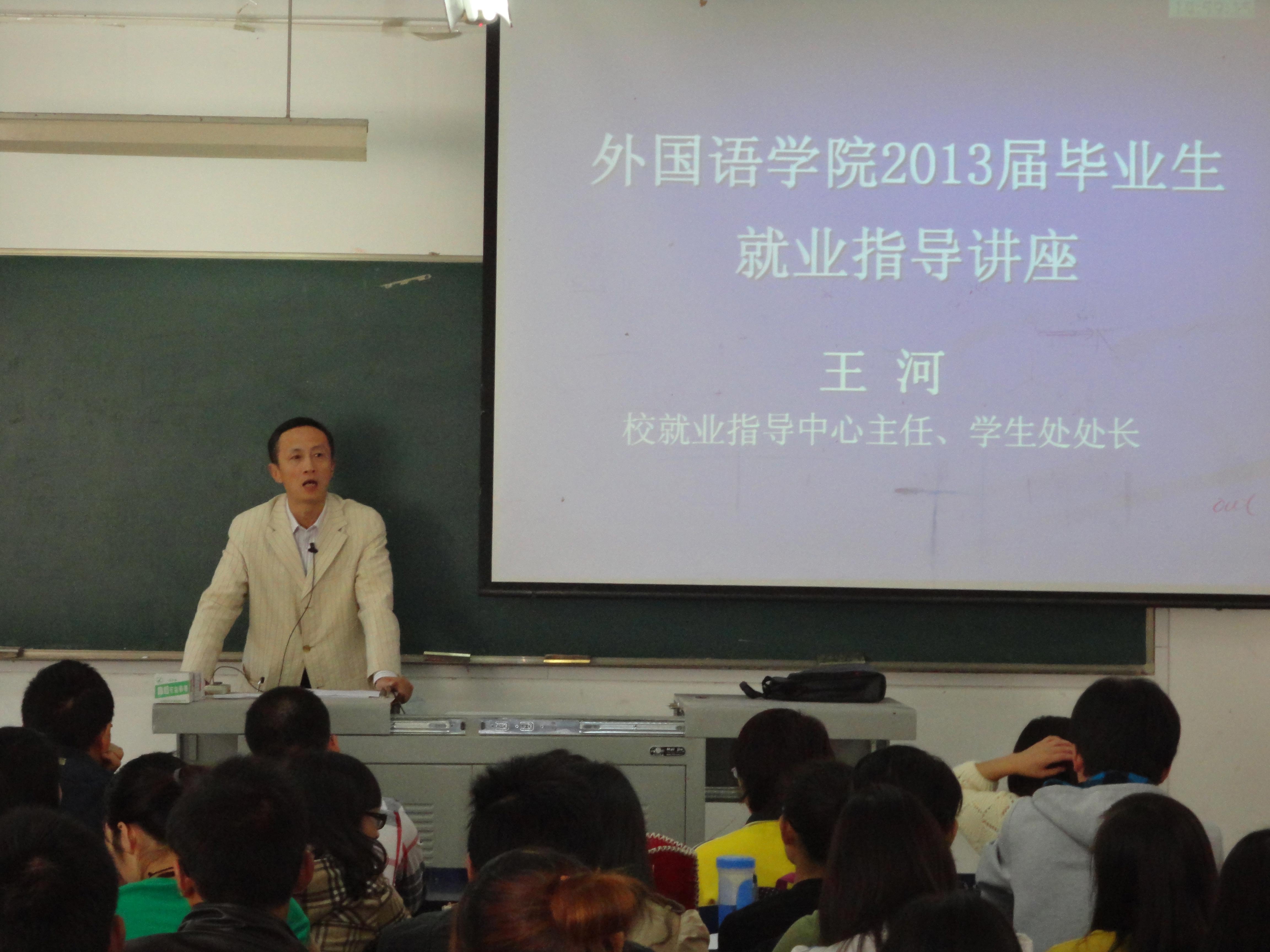 2012年10月17日,外国语学院在5J102举办2013届毕业生就业指导讲座,此次讲座主讲人是校就业指导中心主任、学生处处长王河老师,外国语学院全体2013届毕业生聆听了讲座。
