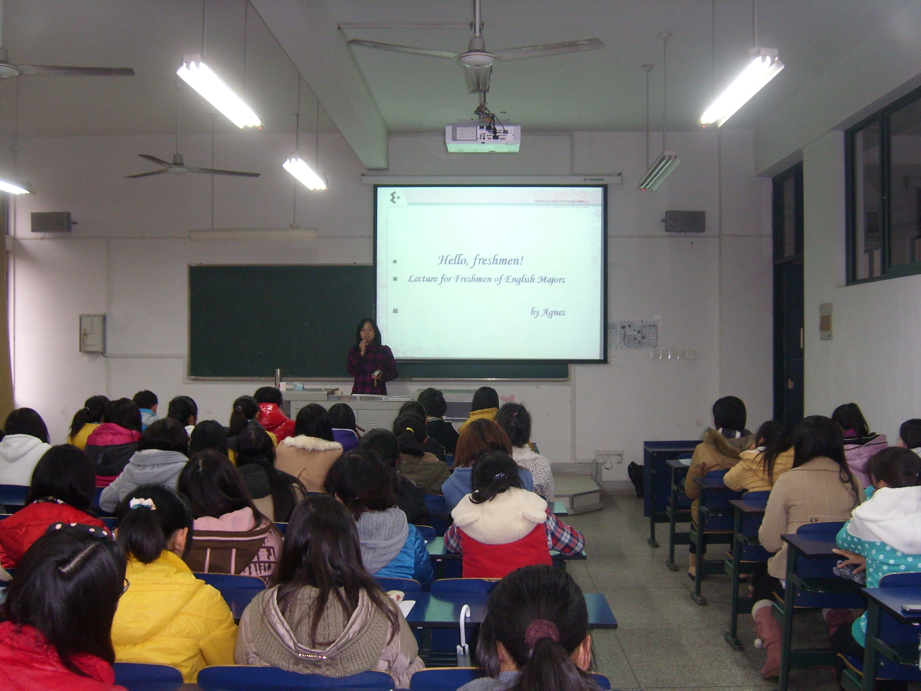 为了使大一新生尽快适应大学学习生活,外国语学院于11月23日下午在5J106举办了关于英语专业学习的“青年创新论坛”活动。本次活动由英语系老师汪景峰主讲,新生辅导员余本祺主持,2012级英语专业全体同学参加了此次活动。