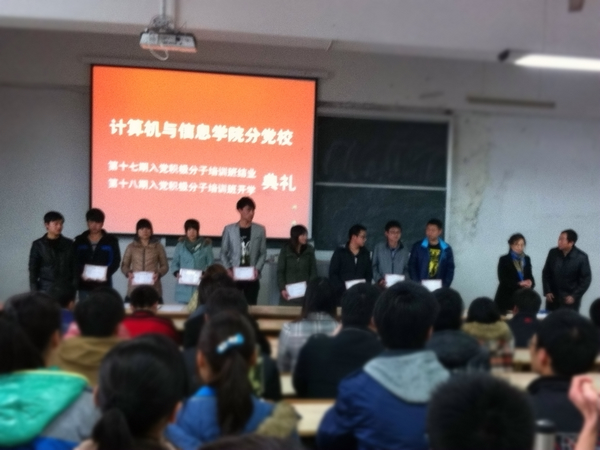 3月20日下午4点,计算机与信息学院第十七期入党积极分子培训班结业暨第十八期入党积极分子培训班开学典礼在2J307教室隆重举行。校党委委员、宣传部部长、校党校副校长苏国红,计算机与信息学院党委书记、院分党校校长邬海量,团委副书记马晓琼,院分党校第十七期入党积极分子培训班班主任皇苏斌,分党校第十八期入党积极分子培训班班主任罗国旗出席了此次会议,第十七期、十八期入党积极分子培训班全体学员参加了典礼,典礼由马晓琼主持。