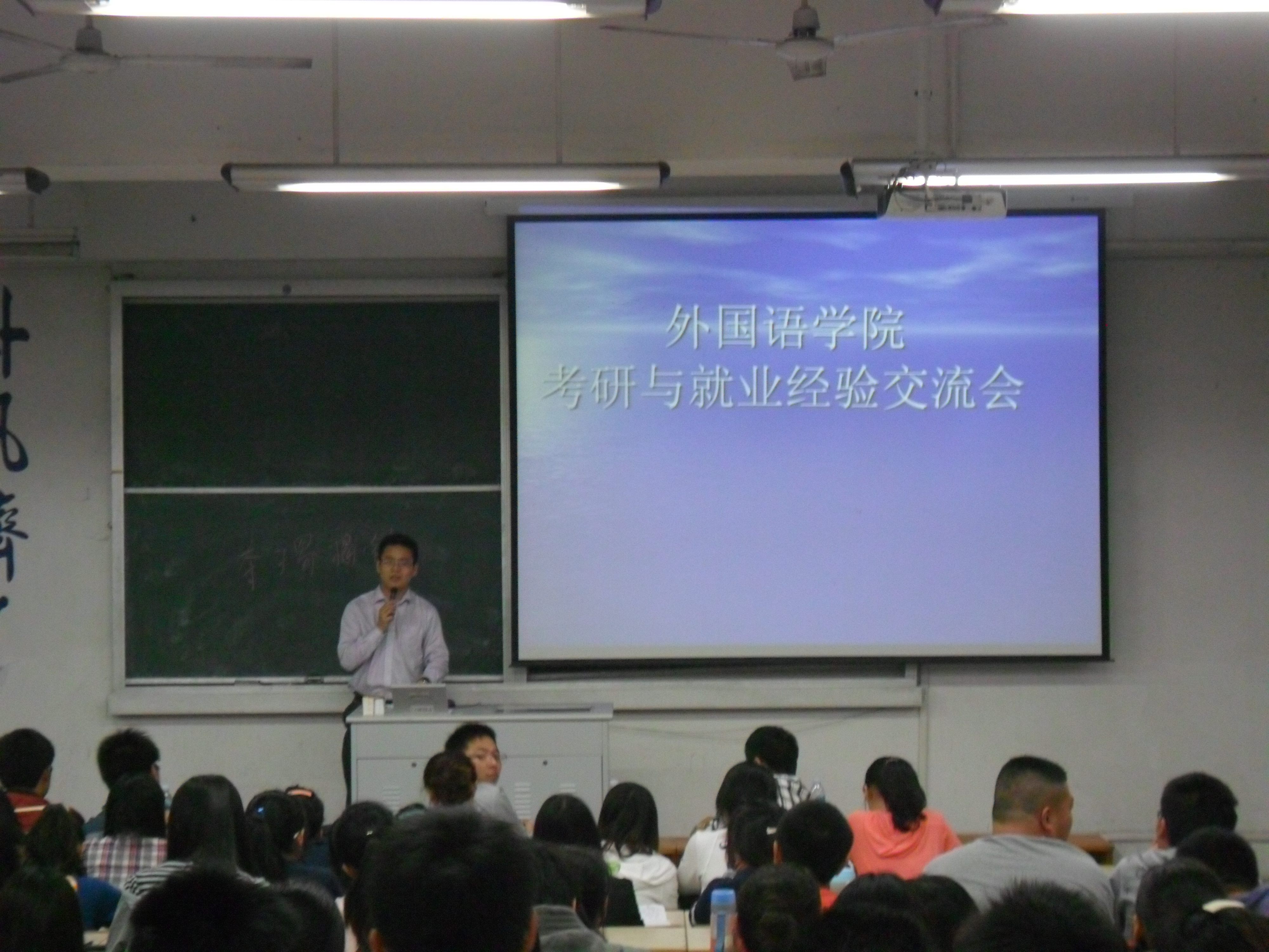 为了帮助2010级大三同学有效地确定毕业后方向,尽快地让他们在思想、行动上早做准备并指导毕业生做好从大学迈向社会这一重要转变,530日,外国语学院于6J106举行了毕业生就业考研交流会,参加会议的有09级优秀毕业生及10级本部与机电学院英语专业学生,辅导员李飞老师出席会议。
