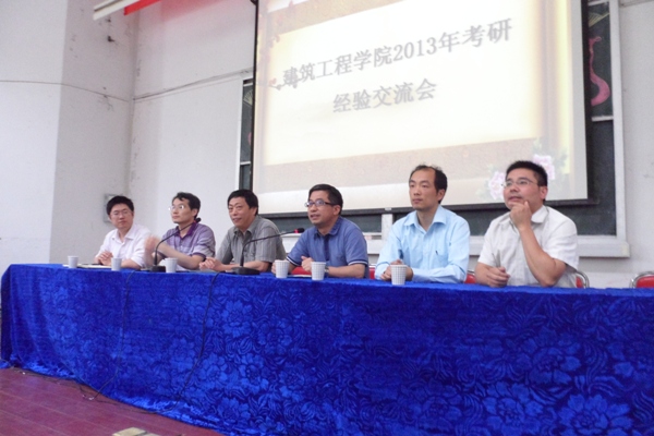 建筑工程学院于6月4日下午在2教报告厅举行2013年考研经验交流会。学院党总支副书记李烨、副院长何芝仙、团总支副书记刘海涛、专业教师韩有民、张明以及各辅导员老师出席交流会。