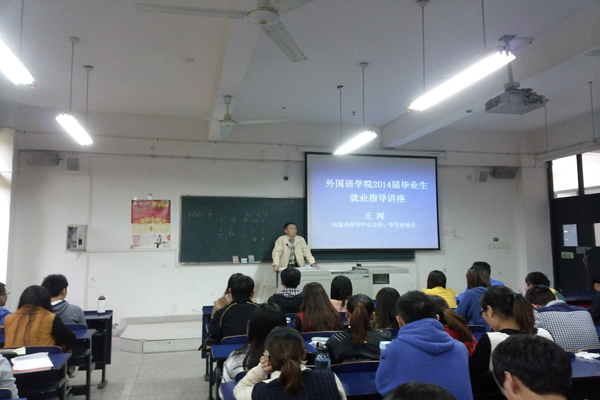 讲座中,王河结合多年的丰富教育管理经验,从大学生就业指导专业角度深入浅出地对就业问题进行了全面深刻的剖析。针对学院对毕业生就业意向所做的问卷调查中反映的情况,他从五个方面进行了破解,并指出,毕业生在实际求职过程中需要把握好这五个方面:一是要了解国内外经济和就业形势,要能从宏观、中观、微观三层面预判当前就业现状,做好充分的就业心理准备;二是要进行专业认知能力和社会认知能力的自我分析,他提醒全体毕业生在就业时要根据自我专业水平和英语专业就业现状合理强化或淡化专业意识;对于考研的同学要做到不要盲目跟风或逃避就业压力,要认真分析备考专业的前景;三是要合理规划,根据就业区域、求职单位、职业选择等要素进行准确定位;四是要精心准备,他强调充分正确的求职准备是成功的重要条件,并对简历制作的注意事项以及面试技巧做了针对性指导;五是要安全就业,他告诫毕业生在求职中要严防传销等招聘陷阱,注意个人信息的安全,最终实现光荣毕业、体面就业、成功创业的美好愿望。