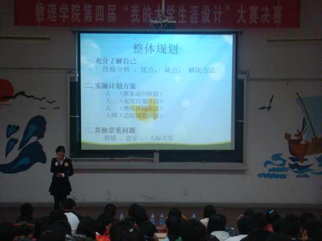 112,数理学院第四届“我的大学生涯设计”大赛决赛在2J报告厅举办。学院党委书记张开炳、党委副书记水心宝、团委副书记郭亚勤、辅导员刘文震以及各兄弟学院学习部部长观看了比赛。担任本次比赛的评委是在校“我的大学生涯设计”比赛中获奖的选手,最终评出一等奖两名,二等奖四名,三等奖六名。