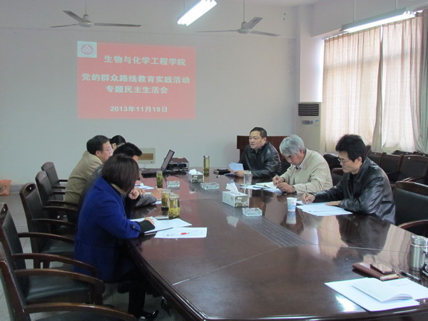 1119上午,生化学院在学院会议室召开党的群众路线教育实践活动专题民主生活会。校党委书记陈其工、校教育实践活动第四督导组副组长余传文到会督查指导。学院领导班子成员、党委委员参加了会议,会议由学院党委书记王弘主持。