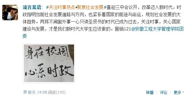 为深入学习贯彻十八届三中精神,激励学生树立正确的世界观、人生观、价值观,管理工程学院于1114日至1124举办了以“关注时事热点•聚焦社会发展”为主题的微博征集大赛。大赛共收到相关作品近四百份,点击阅读量四万余次。