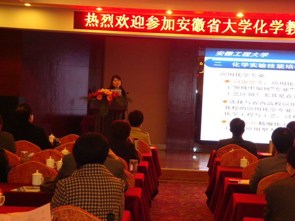 会上,吴之传应邀做了题为以增加实践能力训练,提高应用型人才培养质量的报告。报告以省级特色专业、省级专业综合改革试点应用化学专业为例介绍我校在如何提高应用型人才培养质量方面的一些特色做法。报告选题新颖内容丰富,受到与会专家的广泛关注和一致好评。中国科学技术大学俞书宏教授、淮北师范大学王磊教授、安徽工业大学魏先文教授等代表分别作了专题报告,从化学学科发展前沿,化学与交叉学科发展,科研促进教学等方面进行广泛交流。