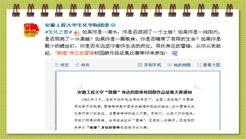 “栀子花”绿色进寝室:3月22日上午,二、三、五食堂门口人气爆棚,这里是志愿者们正在开展大学生绿植领养活动,通过向绿色大使短信投票或扫描二维码关注本活动即可认领养绿植种子一份与大家分享低碳生活,许多同学事先从微博人人微信贴吧上获得消息,特地赶到现场领取绿植种子。这项活动由新浪微博校园与团中央学习部共同发起,向广大师生传播了低碳环保理念,引导、鼓励、支持大学生的绿色生活梦想。