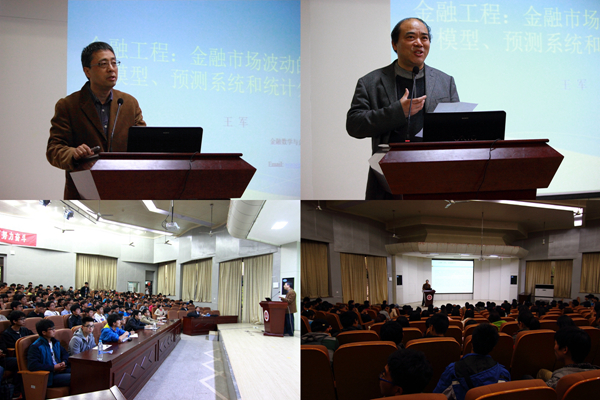 4月21日,北京交通大学理学院王军教授应数理学院邀请来校作了题为“金融工程:金融市场波动的随机模型、预测系统和统计分析”的学术报告。报告会在学术报告厅举行,数理学院党政领导,相关教师,全体研究生及300多名本科生聆听了报告会。报告会由数理学院院长费为银主持。