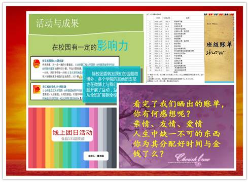 化工122团支部通过问卷调查形式,先了解了同学们的消费支出结构和对家人、朋友的感情投入比例,在班会上和大家一起分析和探讨何为合理的消费;生技122团支部将团日活动现场安排在雕塑公园,同学们坐在草地上晒清明假期的账单,一起聊聊“时间都去哪了”;食品131团支部,作为特别邀请的13级团支部,和大家介绍了利用“微博话题分享”的形式开展此次团日活动的经验。