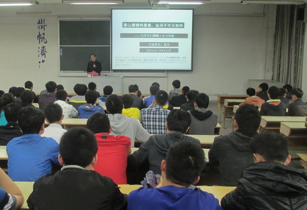 辅导报告在全体学生的热烈掌声中开始。首先,高洪就为何选“春山磔磔鸣春禽,此间不可无我吟”这两句诗作为讲座的题目做了解释。他说,在美丽的校园,满目春光,满园春色,百花齐放,百鸟争鸣,怎能没有我们机械学子的声音;在我们走向创新型国家的征程中,当创新正成为我们这个时代最强音的背景下,怎能没有我们机械学子的声音。高洪希望通过这两句诗来勉励同学们积极参加专利发明与创新活动,锻炼创新意识和能力,为未来的职业发展奠定基础。高洪与同学们一起分享影响他成长的至理名言,结合自身的奋斗经历和人生经验告诉同学们:“奋斗的青春最美丽”。
