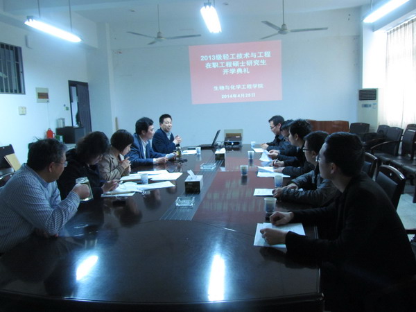 4月25日下午,2013级轻工技术与工程在职工程硕士研究生开学典礼在生化学院会议室举行,学院领导、各硕士点负责人、导师代表及2013级轻工技术与全体工程硕士研究生新生参加了典礼。开学典礼由生化学院院长徐建平教授主持。