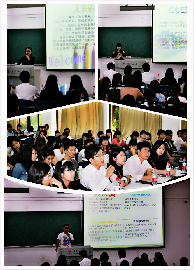 规划改变人生,梦想点亮未来。5月14日下午,以“经营学涯 成就职涯”为主题的外国语学院2014年大学生涯规划大赛决赛在6J112举行。辅导员王钰老师以及2013级全体学生观看了此次比赛。