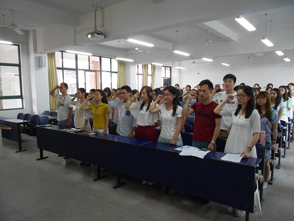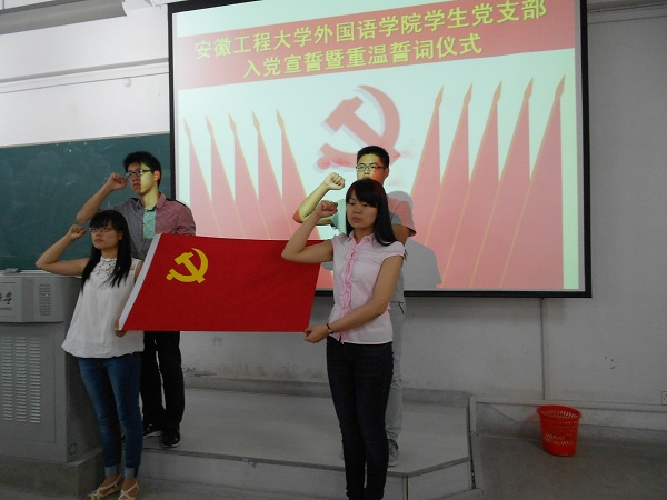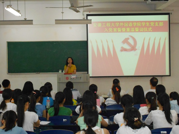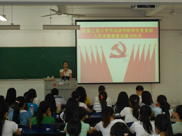 6月18日下午,为喜迎中国共产党93华诞,外国语学院学生党支部入党宣誓暨重温誓词仪式在6教213隆重举行,院党委副书记谈丽华、全体辅导员、10名新发展的党员和全体党员参加了此次活动。
