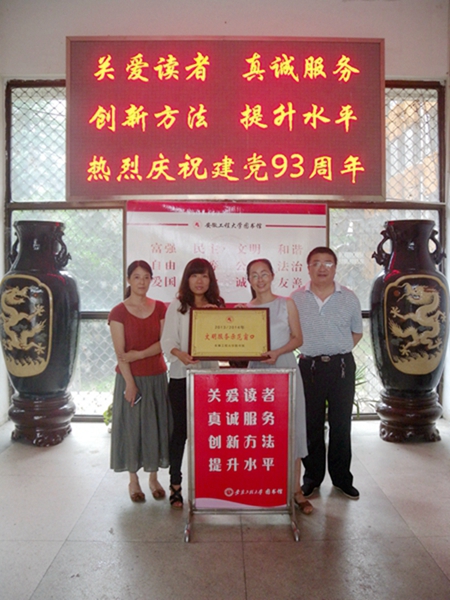 为巩固和扩大党的群众路线教育实践活动的成果,切实将社会主义核心价值观融入到各服务窗口的日常工作中,使图书馆的服务理念和服务水平更加符合读者的需求,在建党93周年来临之际,图书馆党支部于近期在全馆范围内深入开展了 “文明服务示范窗口”评选活动。经过严格的评选程序,最终有三个一线服务窗口荣获“文明服务示范窗口”的称号,并受到了表彰和奖励。
